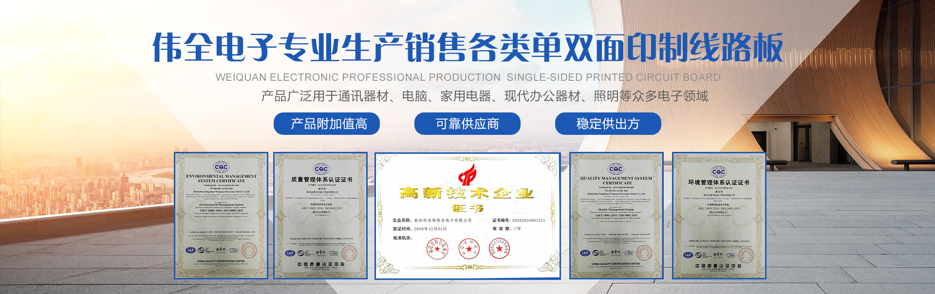 泉州永春偉全電子股份有限公司是一家合資企業(yè)。創(chuàng)辦于2011年,專業(yè)生產(chǎn)各類單面印制線路板,是福建省專業(yè)生產(chǎn)印制線路板的主要廠家,公司坐落在泉州市永春縣桃城鎮(zhèn)留安開發(fā)區(qū)添福工業(yè)園,占地面積達(dá)10多畝,交通方便。公司現(xiàn)有員工80多人,總投資3000多萬元人民幣,年生產(chǎn)能力逾20萬平方米。